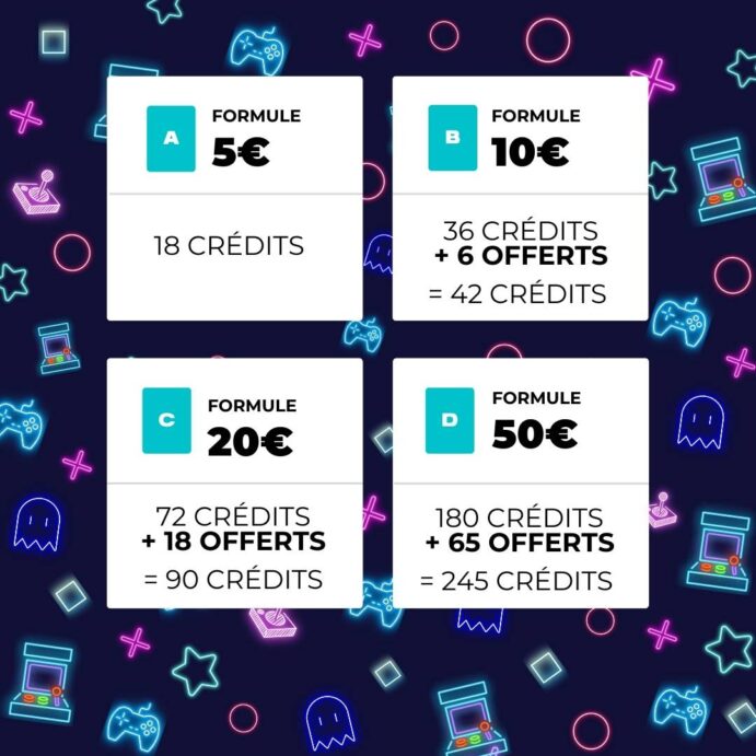 Découvre quatre formules différentes adaptées à tes envies, pour que vous viviez votre expérience unique ! Toutes nos formules de prix vous permettent de profiter de tous les jeux présents dans notre salle d’arcade à Liège 😎